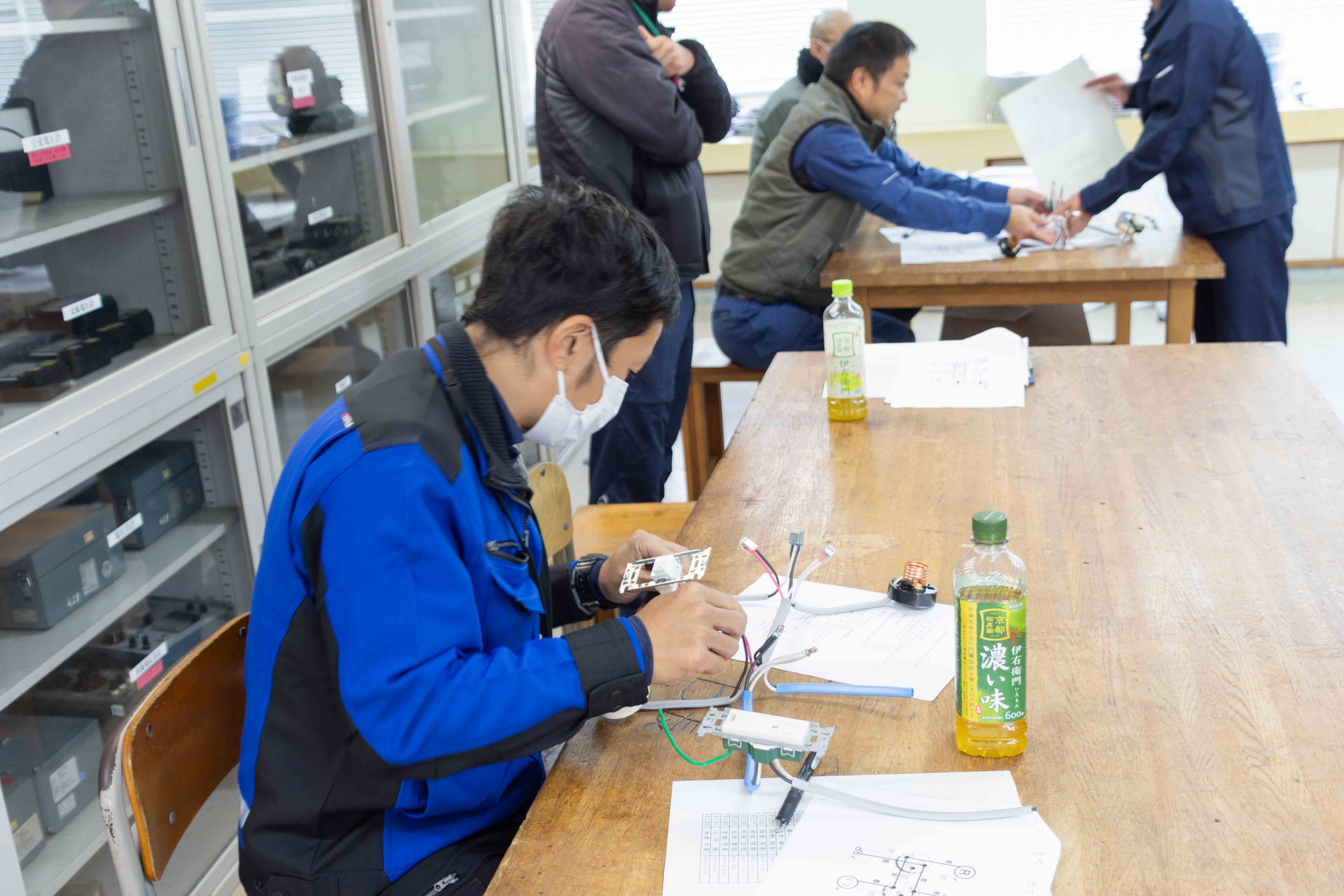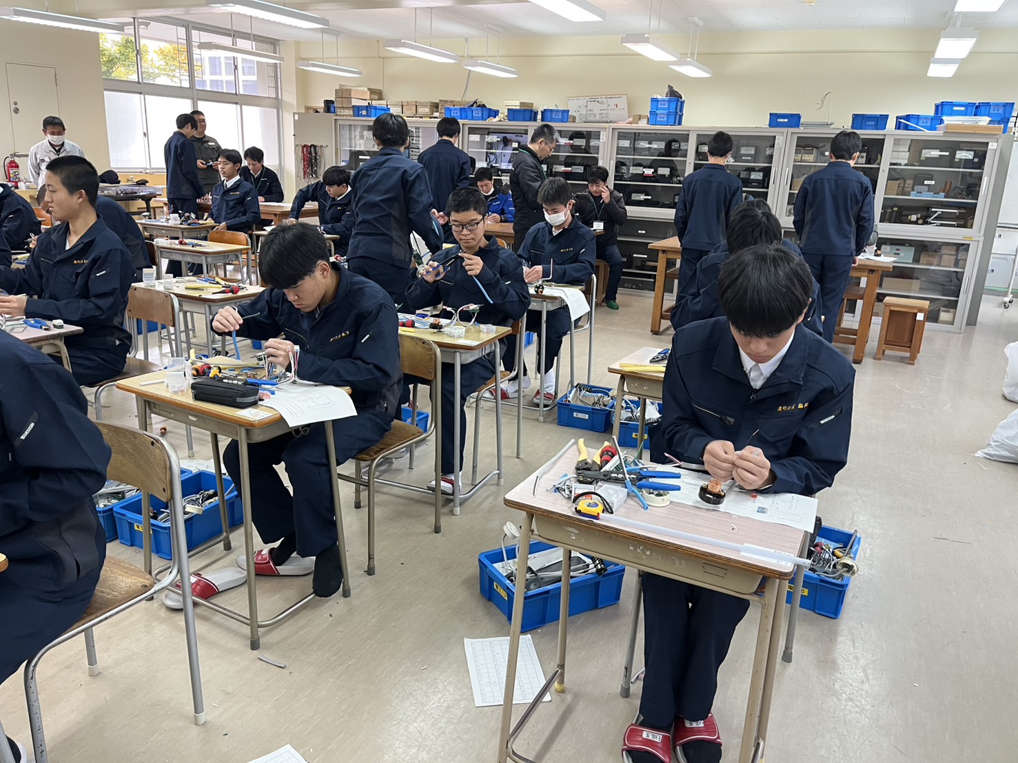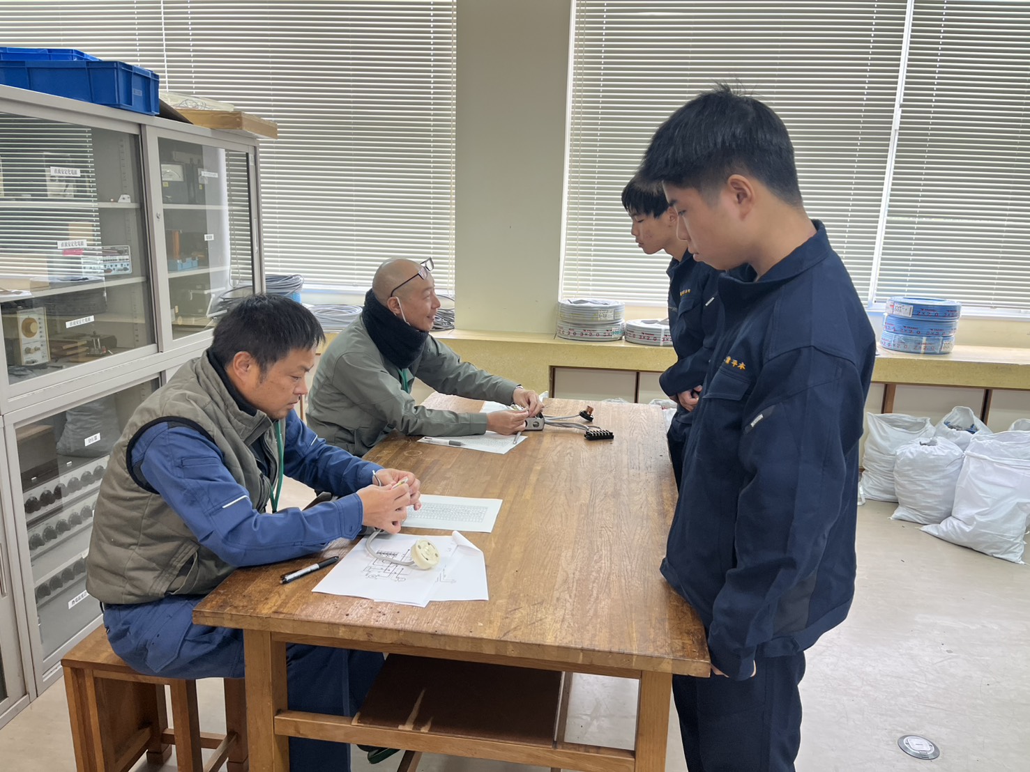 令和7年度『鹿町工業高等学校 電気科向け技能試験対策講座』を開催しました 2025年11月20日 佐世保電気工事業協同組合では、 令和7年11月19日(水)(9:55~11:45)に 第二種電気工事士技能試験を控える 鹿町工業高等学校・電気科1年生 を 対象とした実技指導を行いました。 今回の講座では、第二種電気工事士技能試験の候補問題(No.8・No.9)を中心に、 課題製作の進め方や作業時の注意点、欠陥判断のポイントなど、実技試験に直結する内容を指導しました。